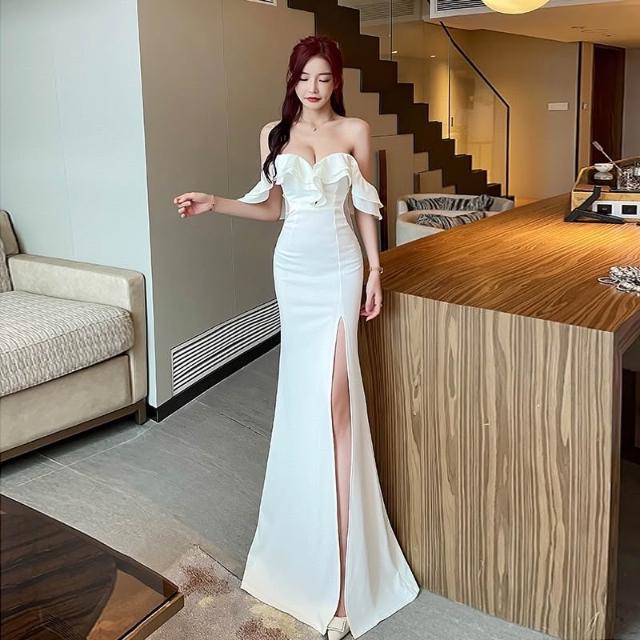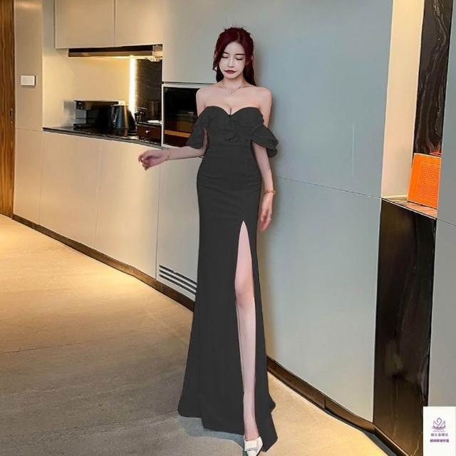 臧女皇荷葉邊抹胸長款開叉顯瘦修身禮服 拖地禮服 主持人車模女裝活動服裝女裝