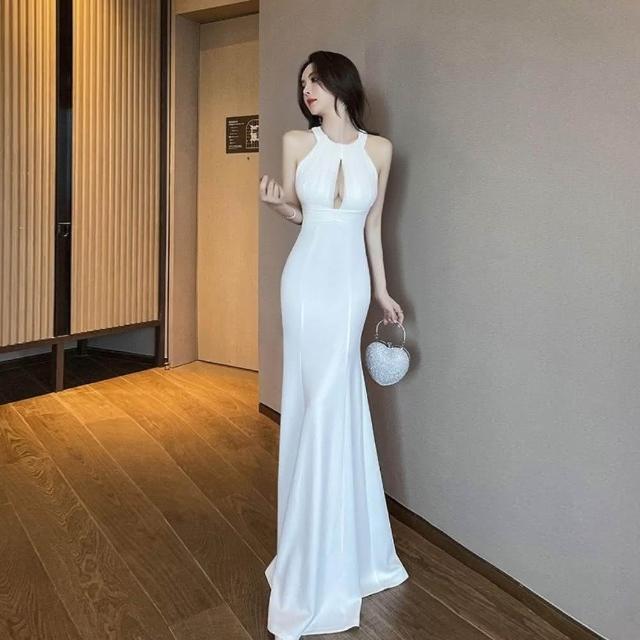 臧女皇主持人禮服 白色禮服 氣質燕尾裙 拖地禮服掛脖高級長裙顯瘦修身晚禮服