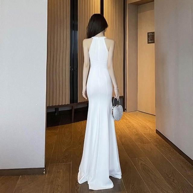 臧女皇主持人禮服 白色禮服 氣質燕尾裙 拖地禮服掛脖高級長裙顯瘦修身晚禮服