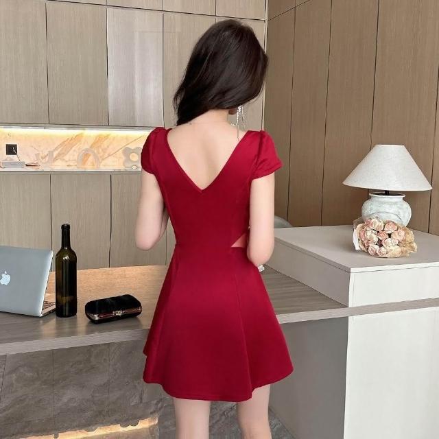 臧女皇特價新款 性感低胸深V收腰大擺A字短裙露背縷空短袖洋裝小禮服 度假休閒聚會派對約會穿搭