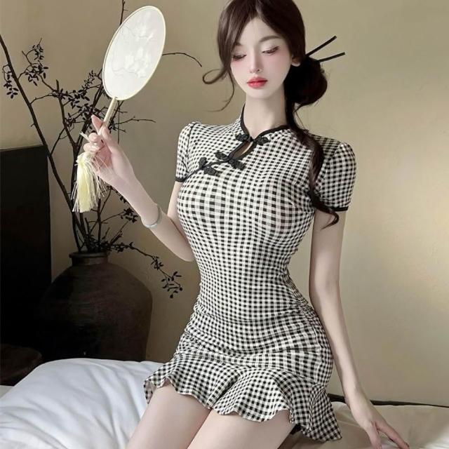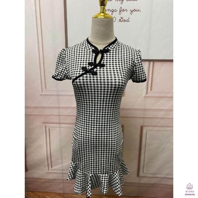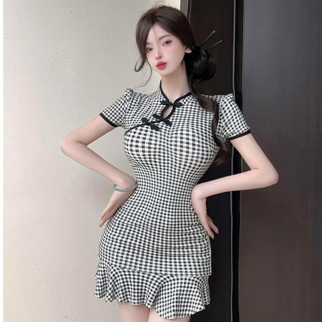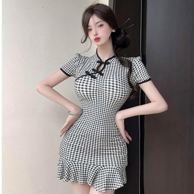 臧女皇新款S-L格子旗袍 性感旗袍鈕釦格子修身包臀裙夜店洋裝連身裙 短裙改良旗袍短袖洋裝禮約會裝扮服度假聚會休閒