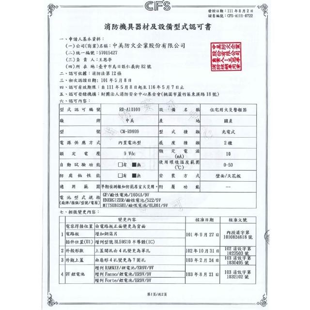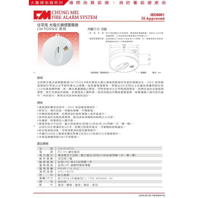 💥消防倉庫💥住警器CM-RD999/贈送電池/偵煙型/住宅用/獨立式/火災警報器/免接電/消防署認可/台灣製造/中美