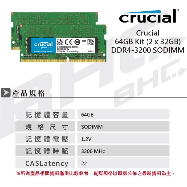 Crucial 美光DDR4 3200 32G*2 筆記型記憶體 (CT2K32G4SFD832A)