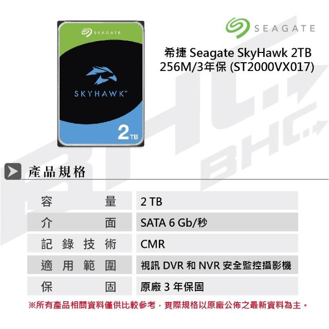 SEAGATE 希捷【SkyHawk】(ST2000VX017) 2TB/5400轉/256MB/3.5吋 監控硬碟