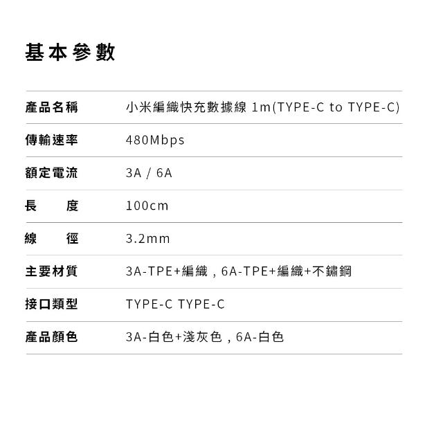 小米 編織快充數據線 3A 6A Type-C (充電線 數據線 編織充電線)