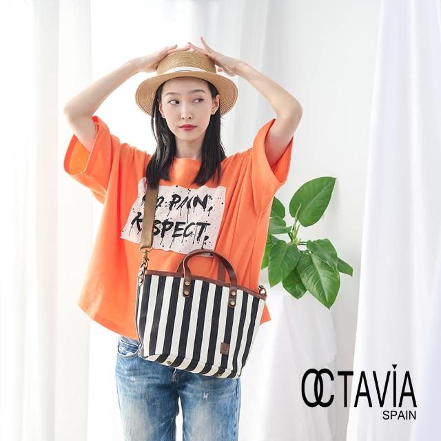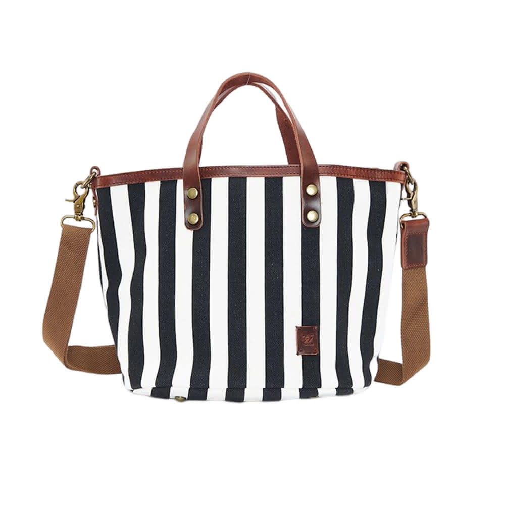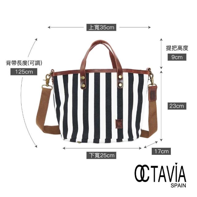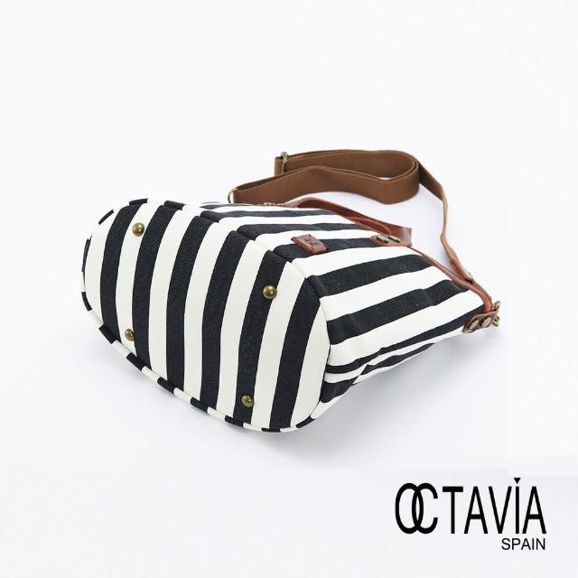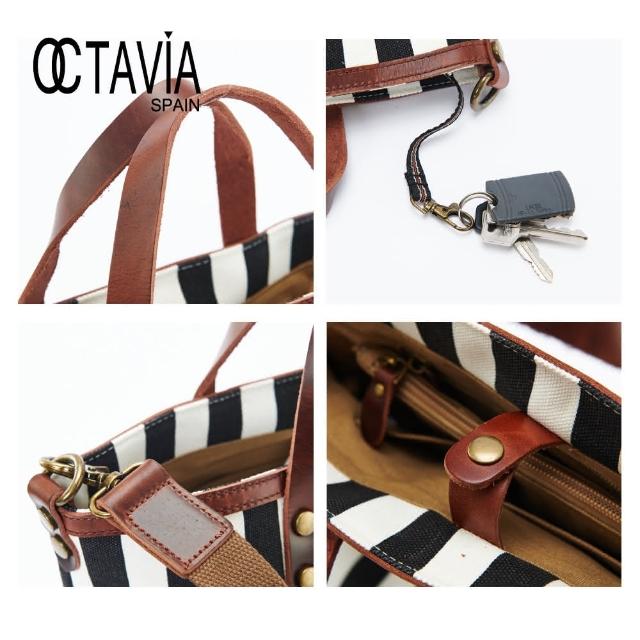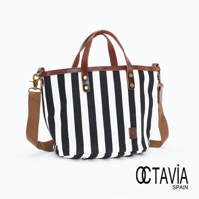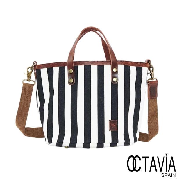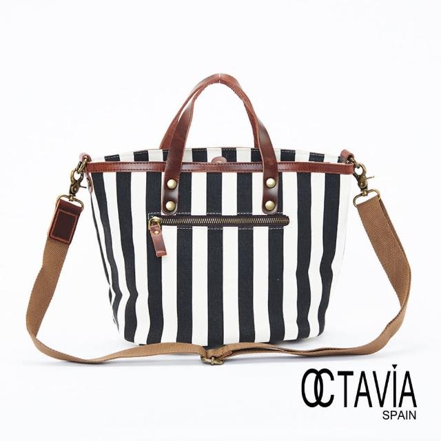 OCTAVIA 8OCTAVIA8 - 海風親吻 真皮配條紋帆布手提肩背包 - 黑白條
