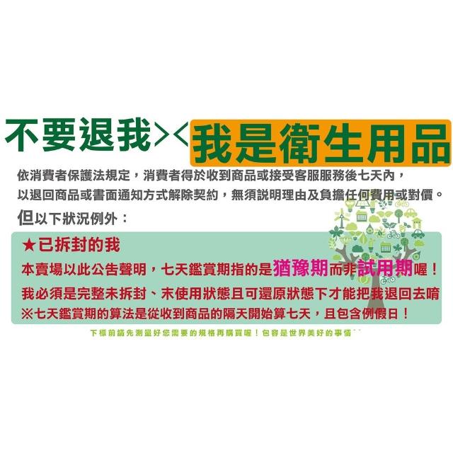 - 個人衛生用品除商品本身有瑕疵外,未拆封商品仍享有十天猶豫期之退貨權利。但已拆封 (如剪標、下水等情形…),依據《通訊交易解除權合理例外情事適用準則》第二條規定,商店無法接受退換貨。