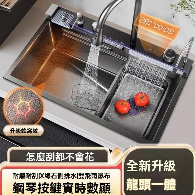 銅龍頭鯨魚水槽 飛雨瀑布304納米黑不銹鋼 家用廚房洗菜盆數顯單槽