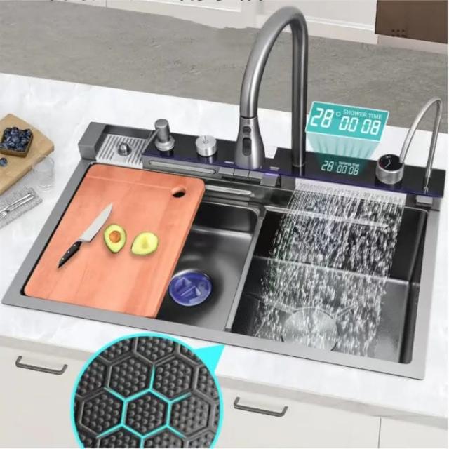 銅龍頭鯨魚水槽 飛雨瀑布304納米黑不銹鋼 家用廚房洗菜盆數顯單槽