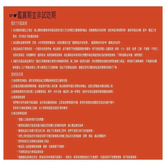 - 時意願降低、臨時取消...等原因辦理退換貨。食品類商品有食用衛生問題非商品瑕疵恕無法為您辦理退換貨,下單前請務必考慮、詢問清楚! 4. 海鮮及乳製品商品類符合「通訊交易解除權合理例外情事適用準則」第二條第一項(易於腐敗、保存期限較短或解約時即將逾期之商品), 將排除7日解除權時,不再適用消費者保護法(以下簡稱消保法)第19條規定之7日解除權。因此不受理商品退貨,請確定您所訂購的商品是您需要的再進行下單。