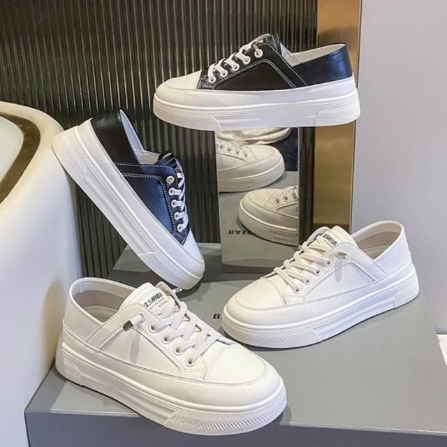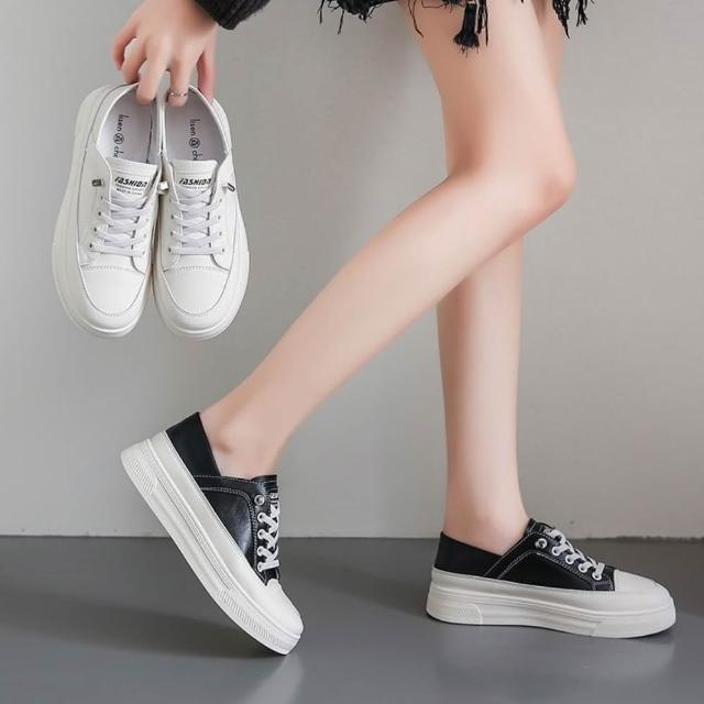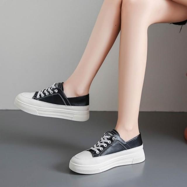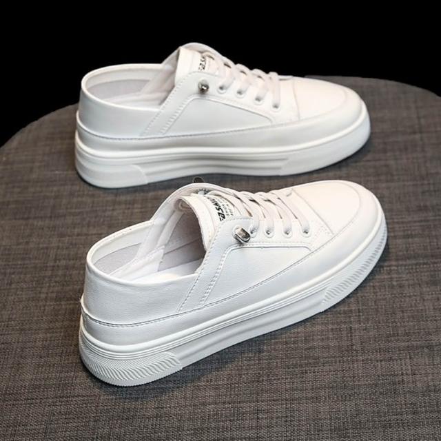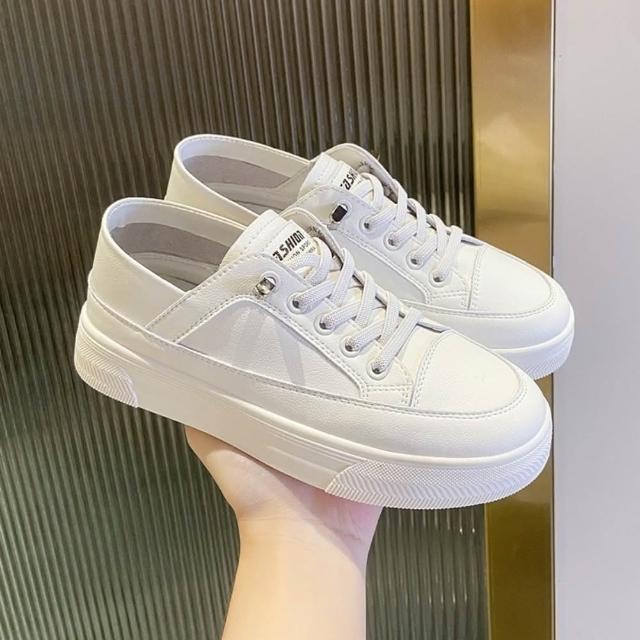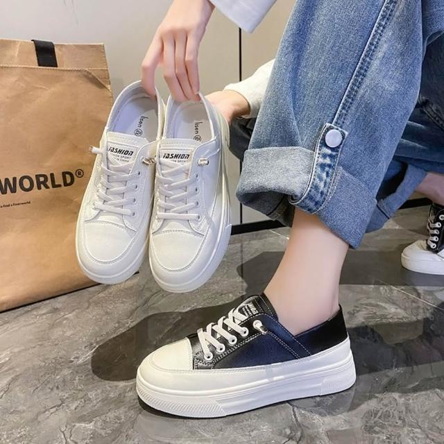 兩穿式韓版免綁帶厚底休閒鞋小白鞋平底懶人鞋素面簡約一腳蹬懶人風