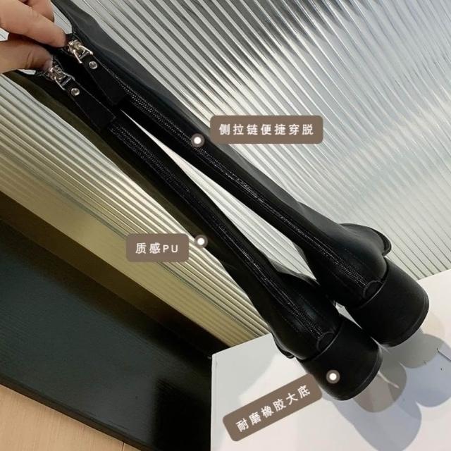 大尺碼 圓頭V口粗跟靴 後拉鍊素色高筒靴 長靴 機車靴 V口中跟長靴 不過膝長筒靴 靴子