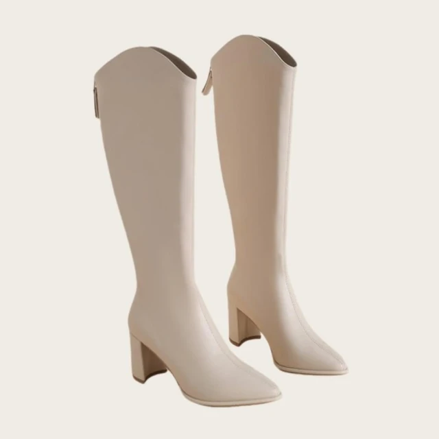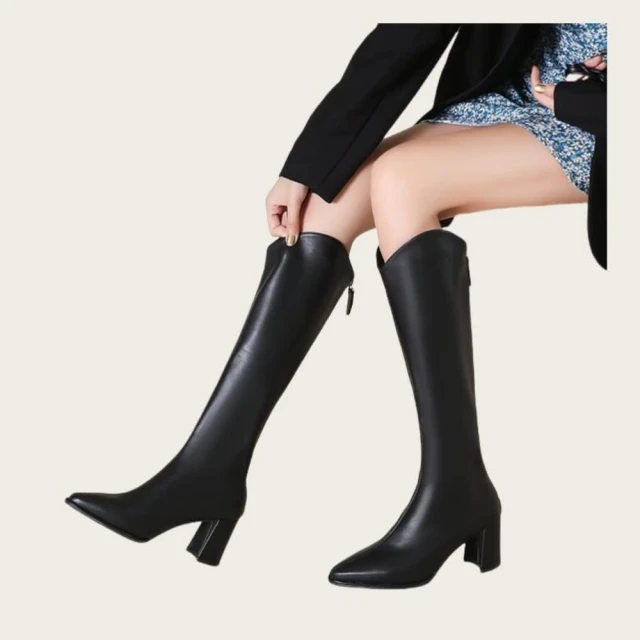 個性時尚V口高跟長筒靴 不過膝長靴 尖頭後拉鍊粗跟馬靴 偽娘大碼靴