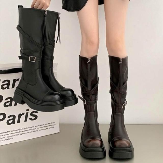 酷颯風厚底前拉鍊長筒靴 美拉德穿搭交叉特色馬丁厚底靴 機車靴 不掉筒長靴馬靴 復古2色靴子