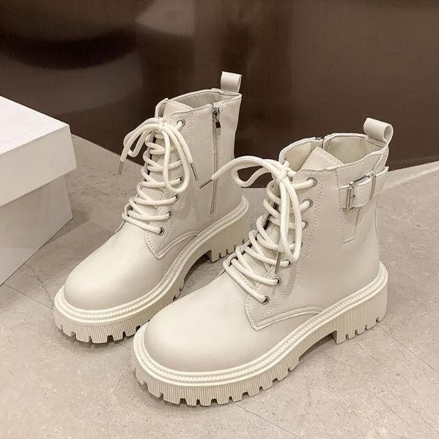 大尺碼女厚底增高鋸齒短靴 率性綁帶X金屬扣環馬丁靴 英倫風綁帶靴 軍風造型馬丁靴 短靴