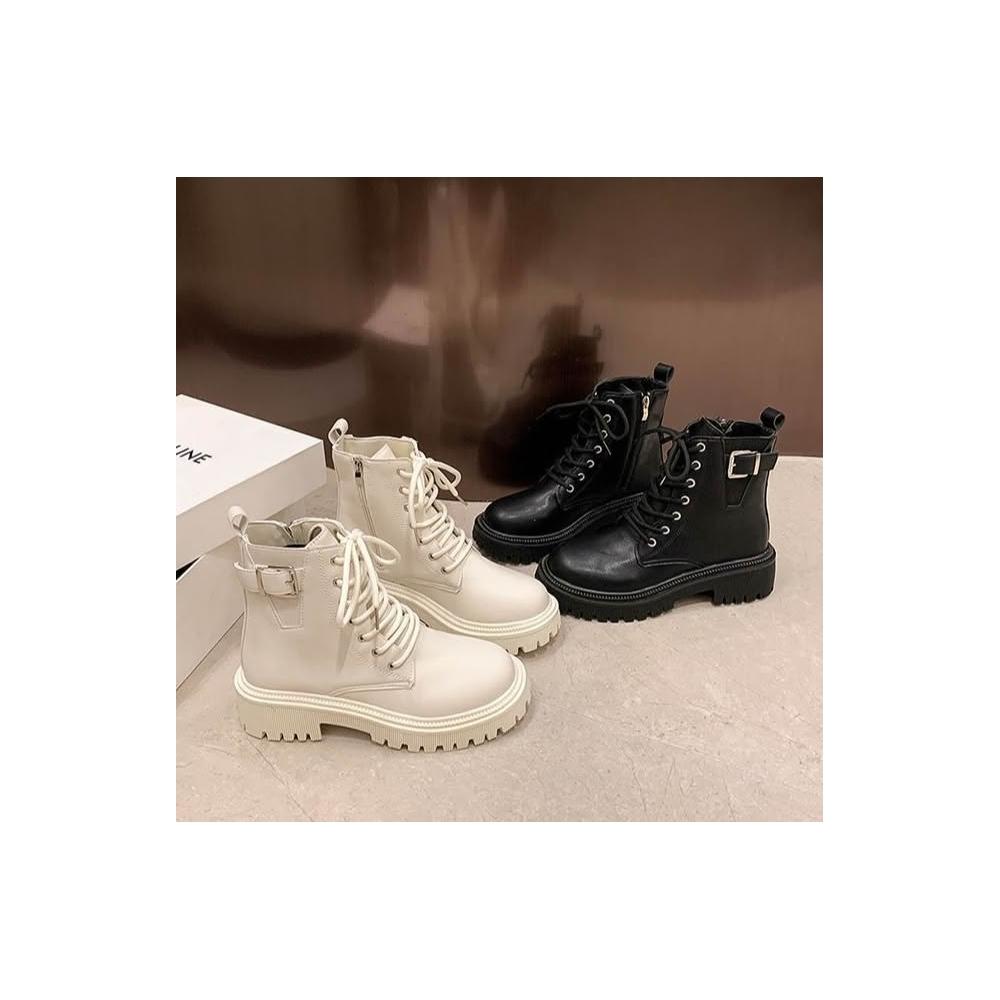 大尺碼女厚底增高鋸齒短靴 率性綁帶X金屬扣環馬丁靴 英倫風綁帶靴 軍風造型馬丁靴 短靴