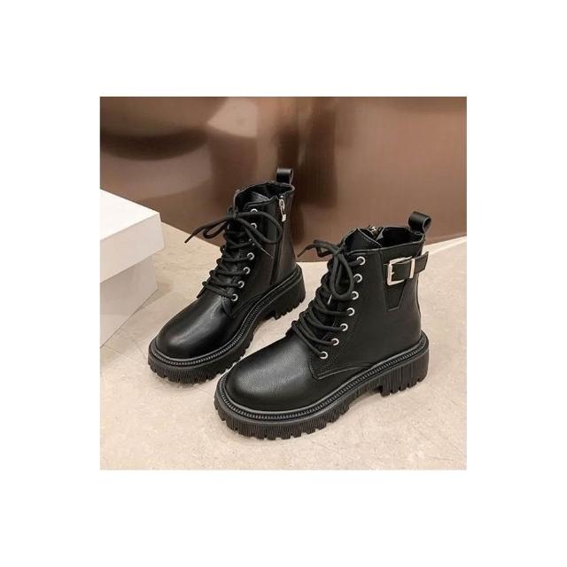 大尺碼女厚底增高鋸齒短靴 率性綁帶X金屬扣環馬丁靴 英倫風綁帶靴 軍風造型馬丁靴 短靴