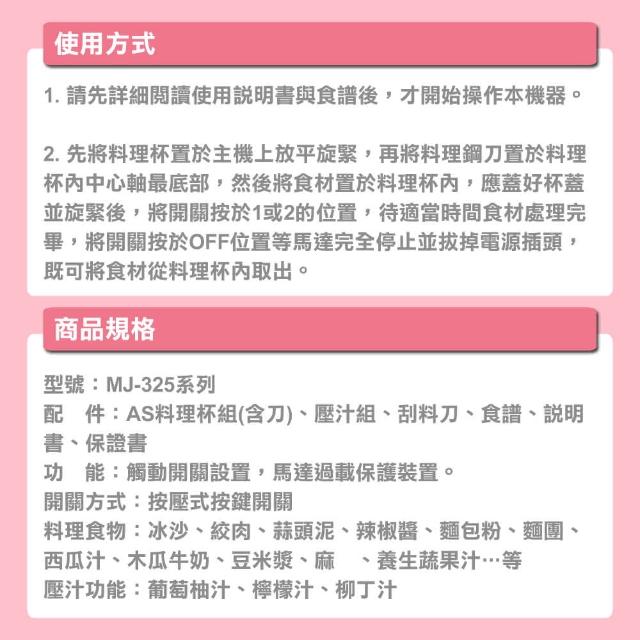 Wongdec 王電工業 廚中寶第二代單功能果菜料理機(MJ-325A 櫻花粉 - 果汁機 果菜汁機 冰沙機 果菜食物料理機)