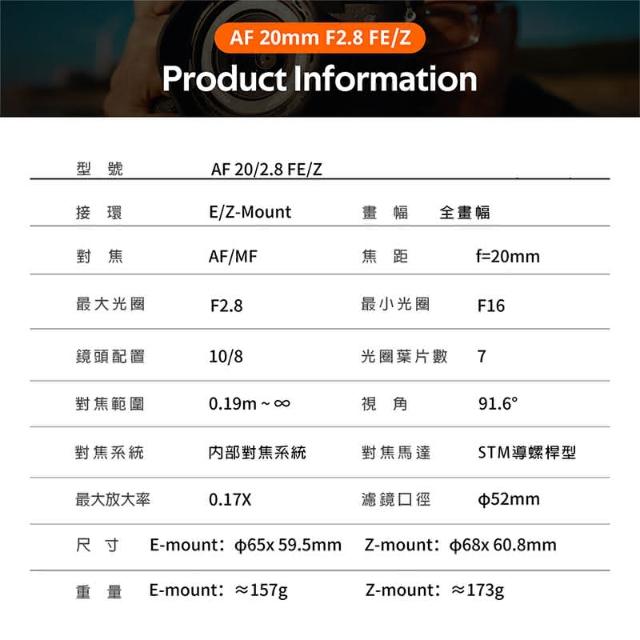 VILTROX唯卓仕 Viltrox AF 20mm F2.8 Air系列 Z-mount NZ 超輕量 廣角 大光圈 全畫幅 自動對焦 鏡頭