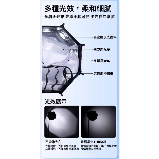 - 多層柔光布,光線柔和可控