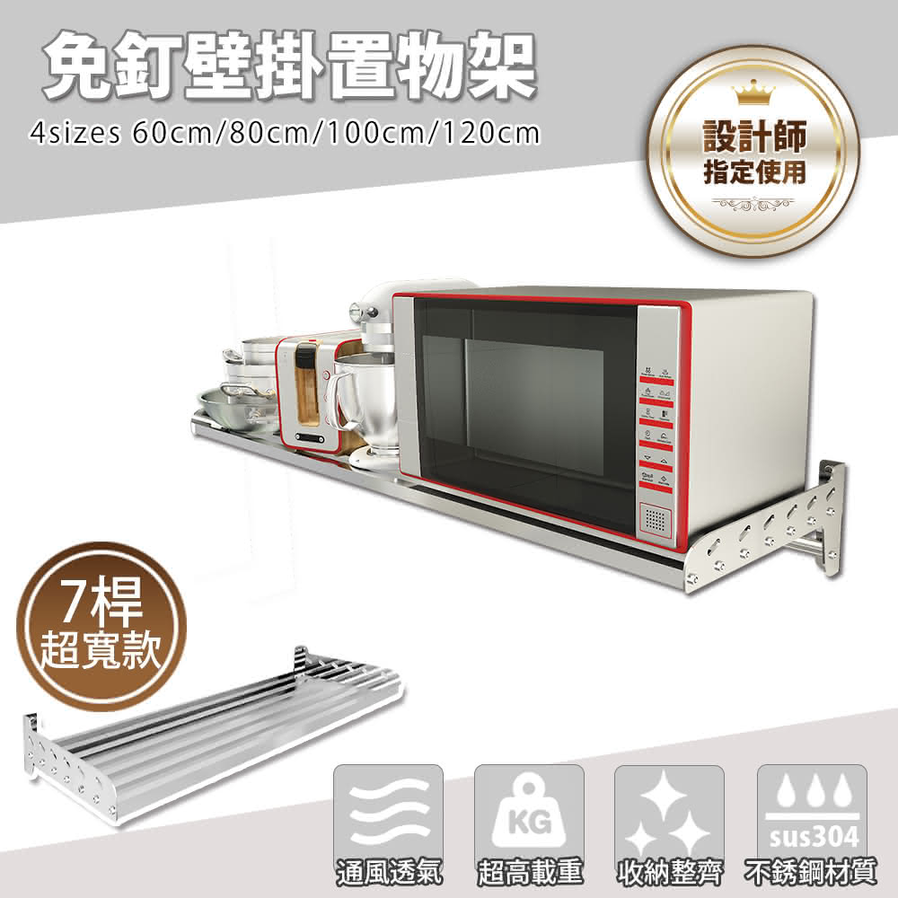 FL 生活+304不銹鋼免釘壁掛置物架-7桿超寬款-120公分FL-137(廚房層架 微波爐架 電器架)