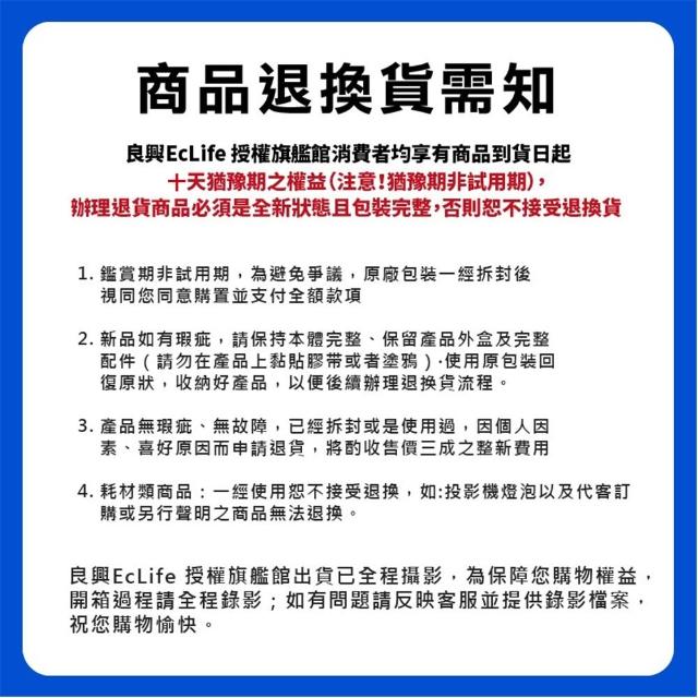 - 商品到貨享十天猶豫期之權益(注意!猶豫期非試用期),依法辦理退貨商品必須是全新狀態且包裝完整(包含主機、附件、內外包裝、隨機文件、贈品等)。如商品一經拆封或使用致商品價值受損(例僅得以福利品出售),商店將向消費者就商品一部或全部價值減損收取適當之費用(回復原狀、整新費),否則將影響退貨的權限。請先確認商品正確、外觀可接受,再行開機/使用,以免影響您的權利,祝您購物順心。