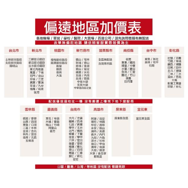 - 針對大型商品(包括:大型家電、家具床墊、健身按摩器材、車類...等),商店將於完成收款確認後,一天內〈不含例假日〉將會有專人與您確認相關配送細節等的聯繫。偏遠地區、樓層費及其它加價費用,皆由商店於約定配送時一併告知,商店將保留出貨與否的權利。