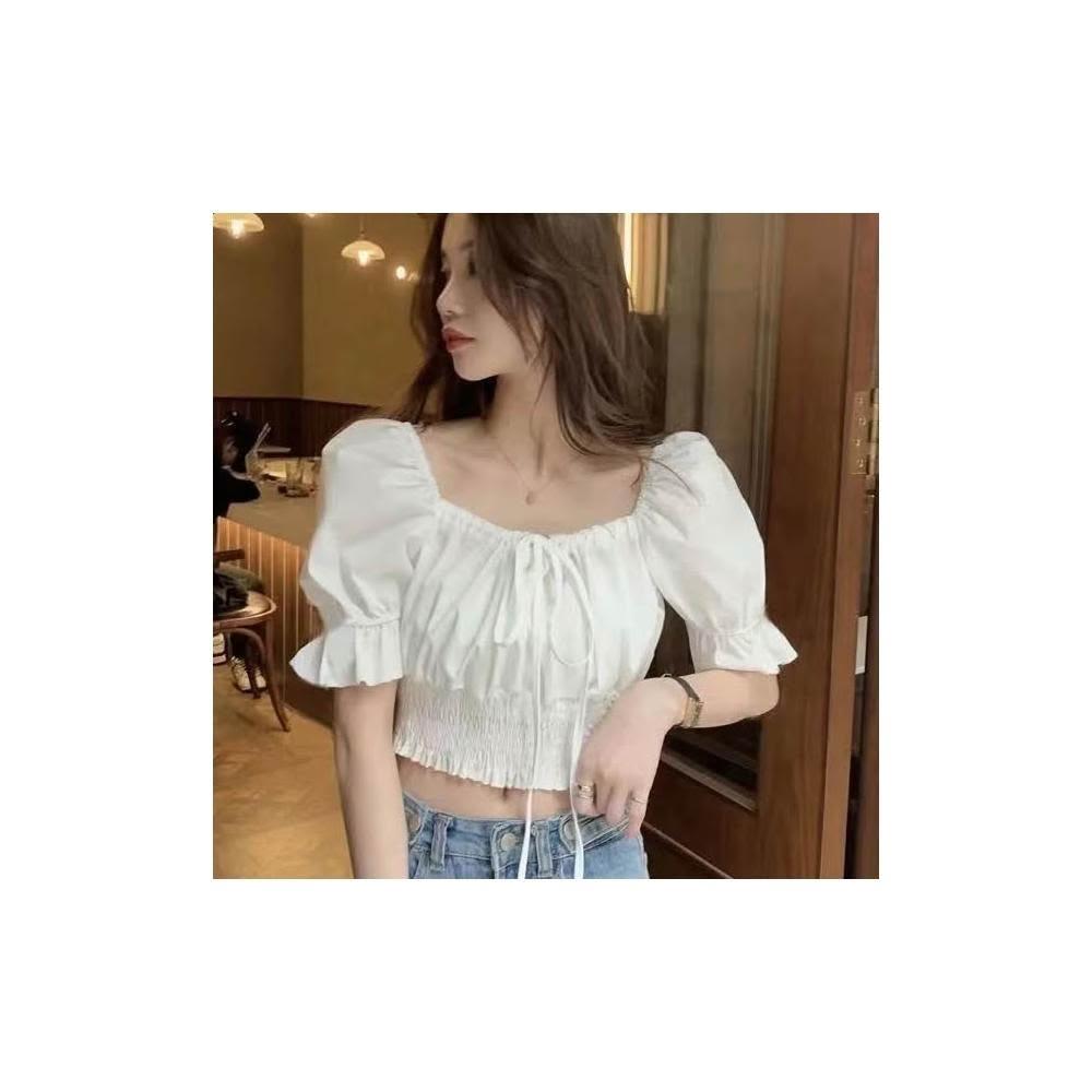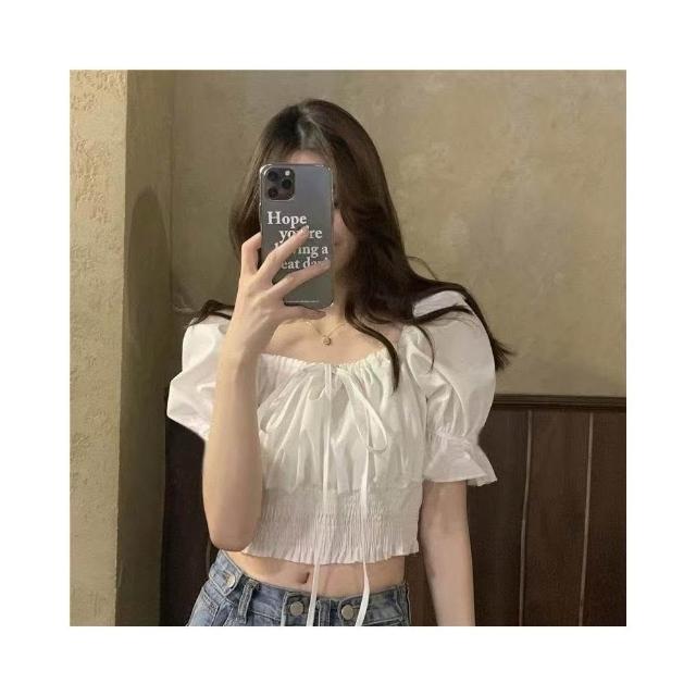FUXI 法式方領襯衫女 短袖襯衫 泡泡袖襯衫 一字領上衣 露肩上衣 短版上衣 短袖t恤 女裝 衣服