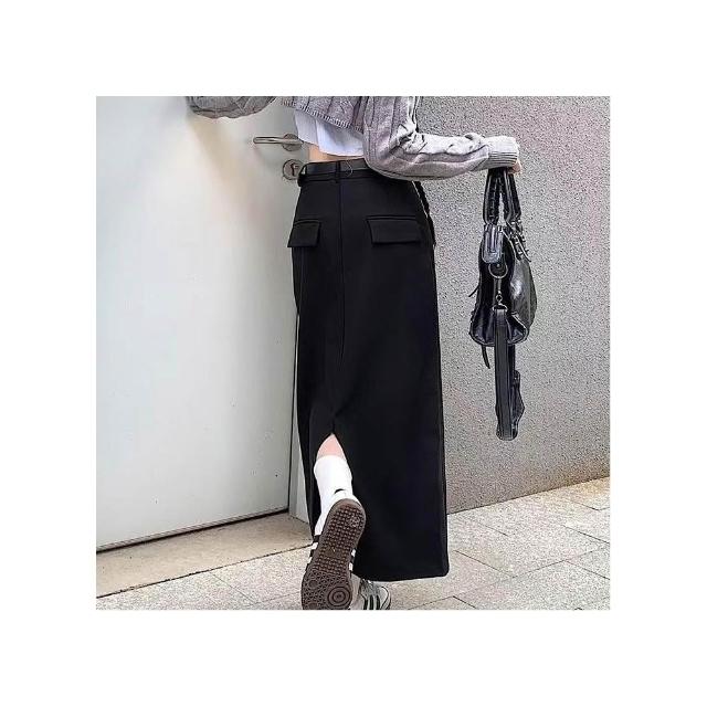 FUXI 灰色西裝長裙女 高腰顯瘦半身裙 中長裙 學院風A字裙 女生裙子 西裝裙 辣妹長裙