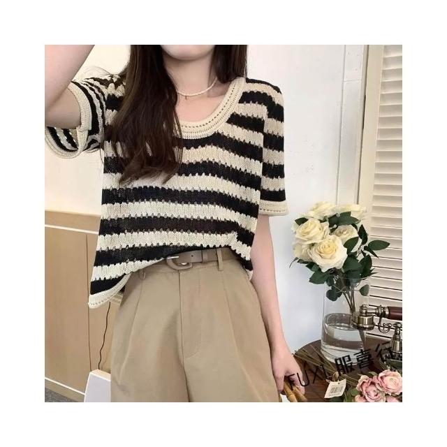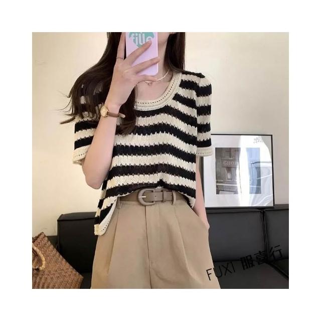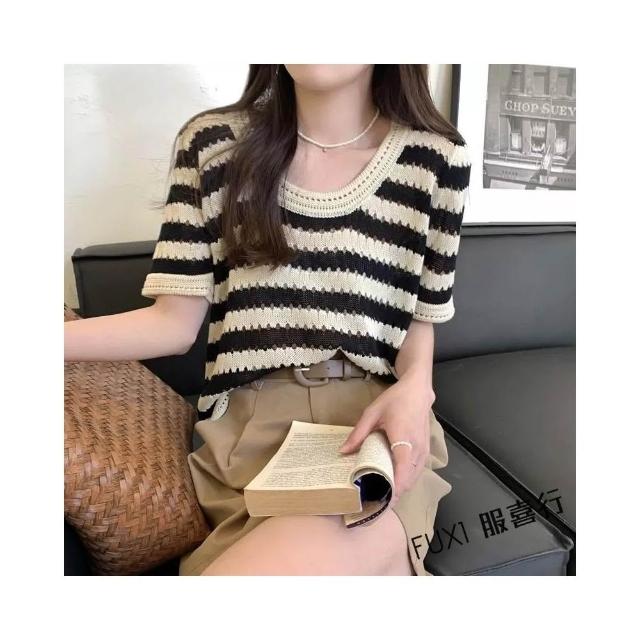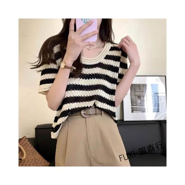 FUXI 復古條紋短袖t恤女 現貨上衣 美式圓領鏤空設計針織上衣 短袖針織衫 寬鬆顯瘦短版上衣 女裝 衣服
