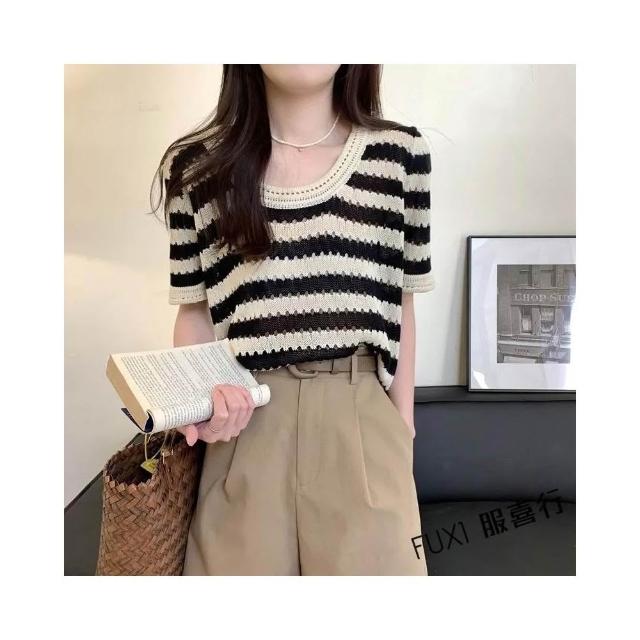 FUXI 復古條紋短袖t恤女 現貨上衣 美式圓領鏤空設計針織上衣 短袖針織衫 寬鬆顯瘦短版上衣 女裝 衣服