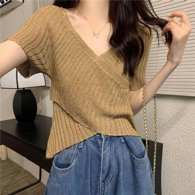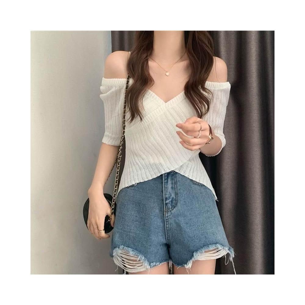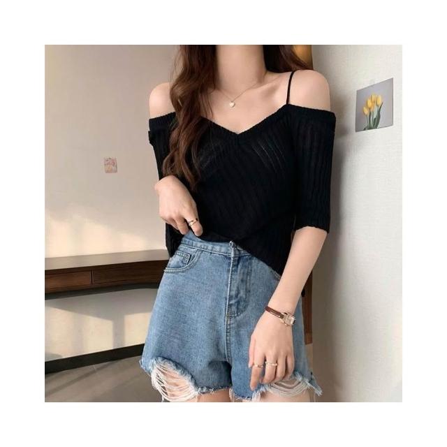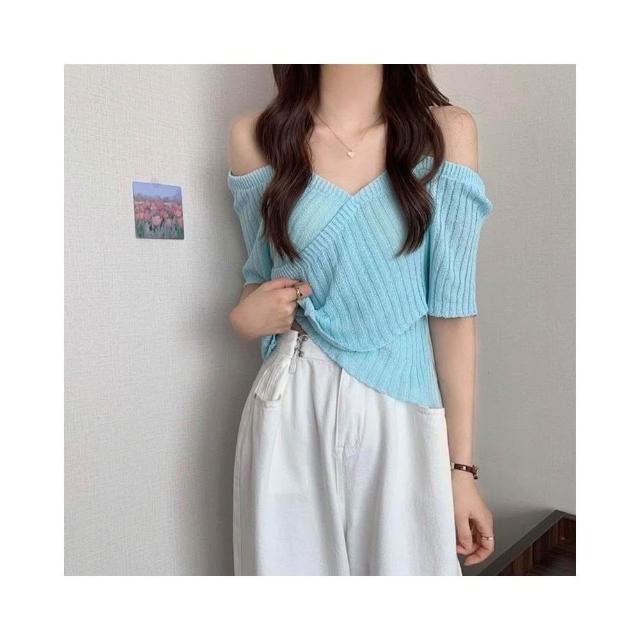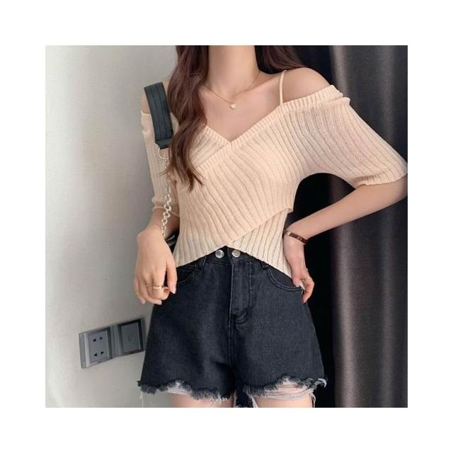 FUXI 一字肩吊帶露肩短袖針織上衣女 辣妹性感上衣 不規則交叉短板上衣 短袖上衣 女裝 衣服