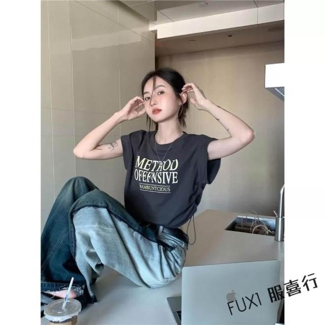 FUXI 美式復古短袖t恤女 寬鬆顯瘦t恤 收腰短版露臍抽繩上衣 設計感 辣妹正肩t恤