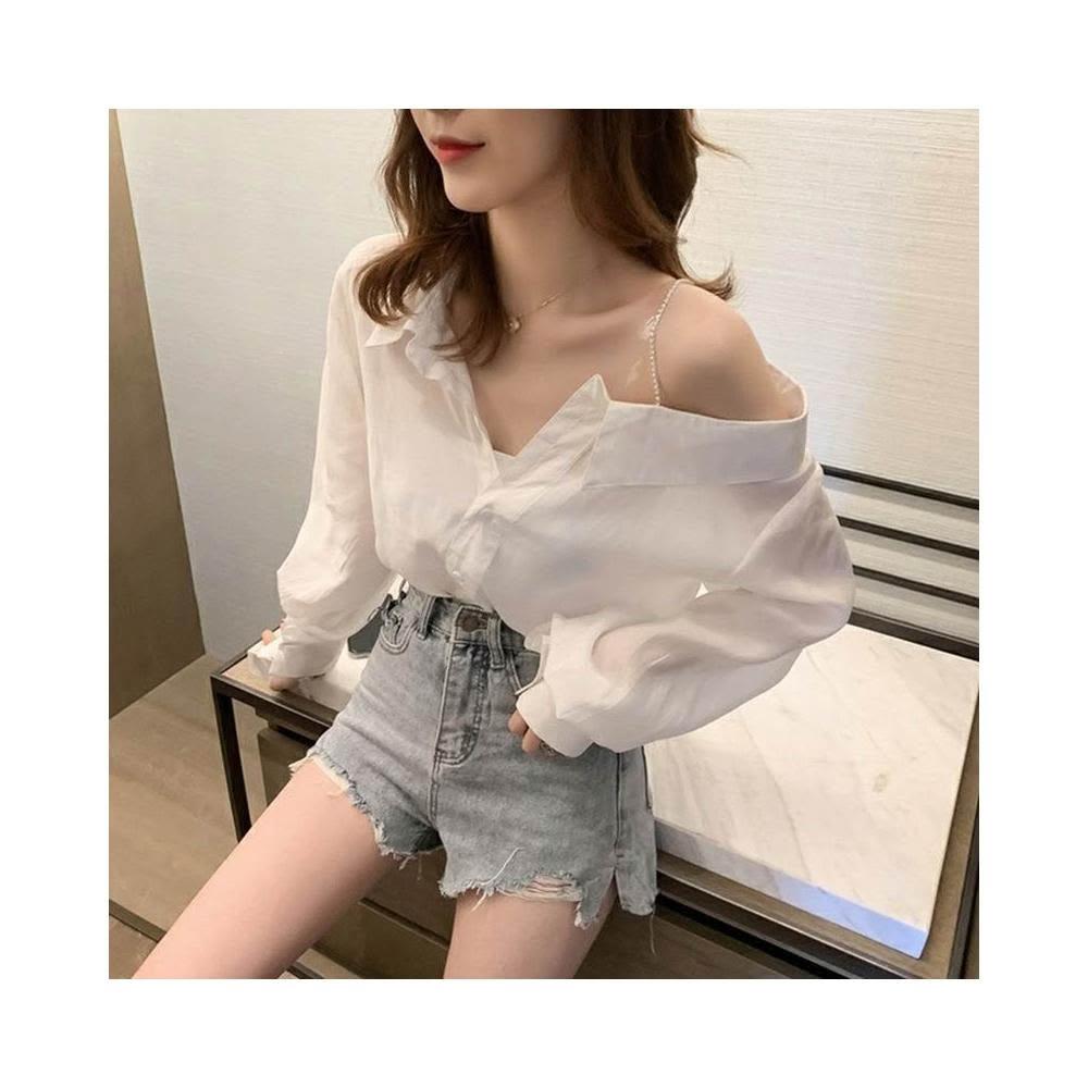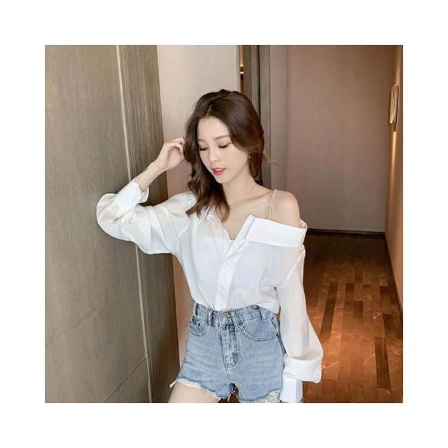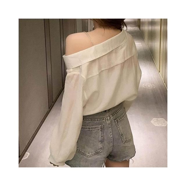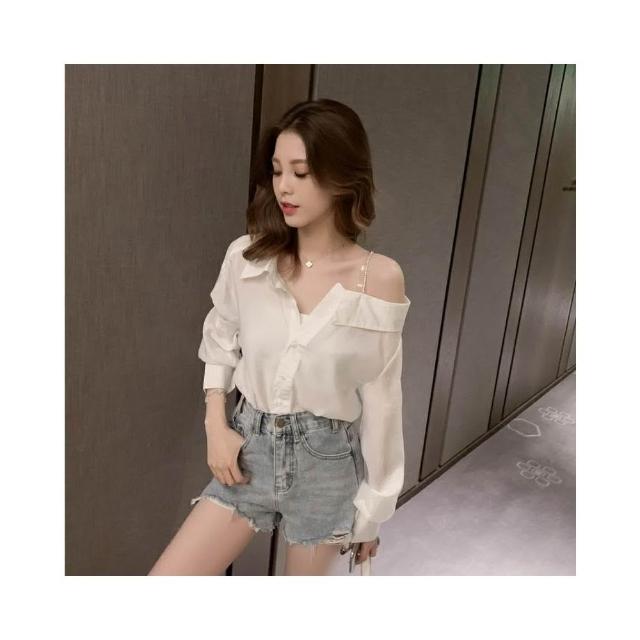 FUXI 韓版寬鬆顯瘦露肩襯衫女 長袖襯衫 性感薄款透膚襯衫 白色上衣 女生襯衣 女裝