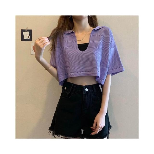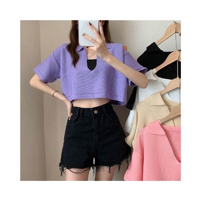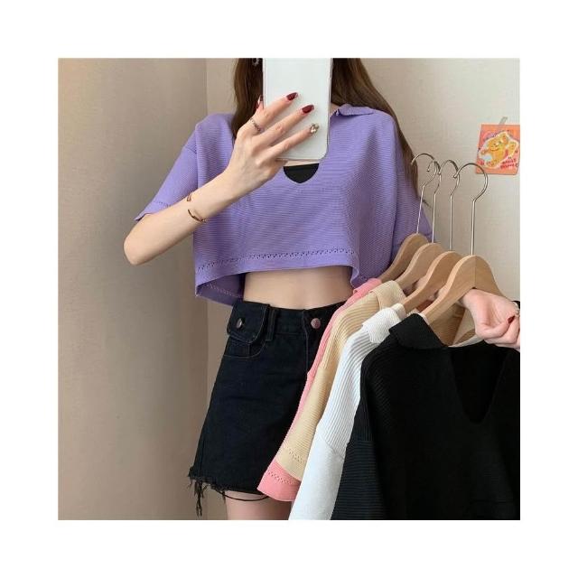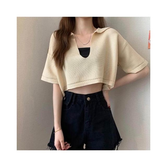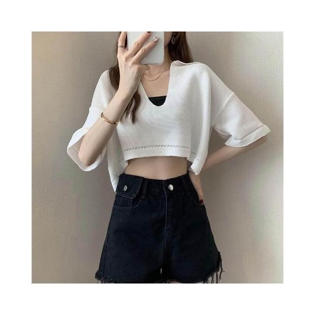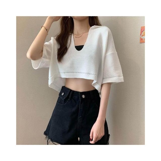 FUXI 短版針織上衣女 V領套頭針織衫 寬鬆罩衫 韓版薄款短袖上衣 翻領上衣 短板衣服 女裝
