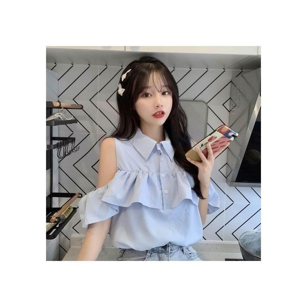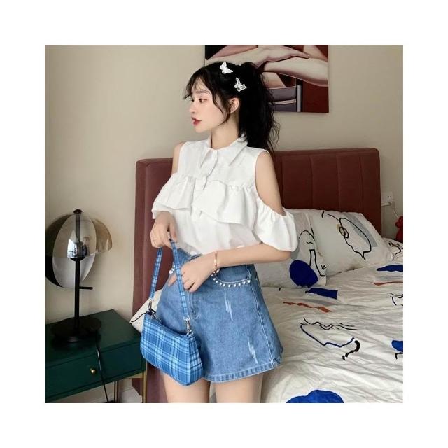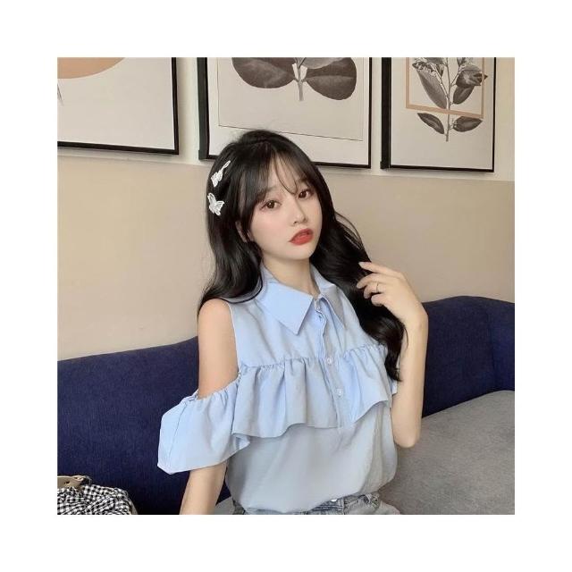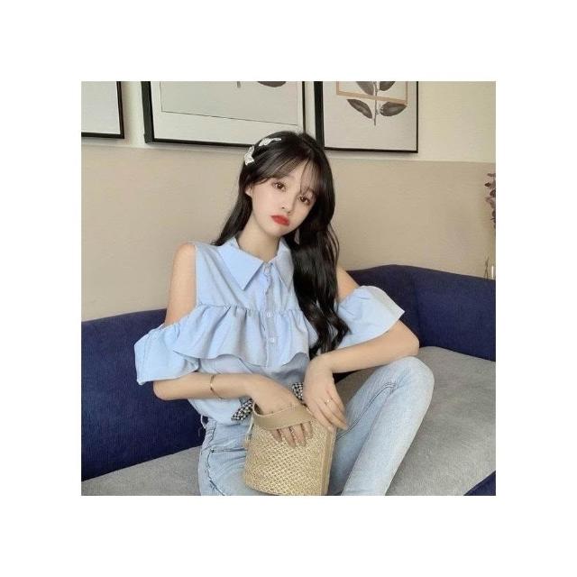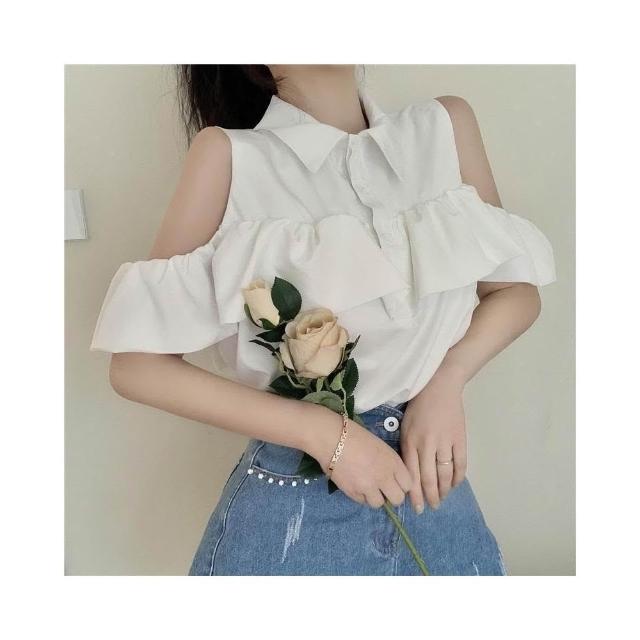 FUXI 短袖露肩襯衫女 娃娃衫翻領襯衫 短袖上衣 氣質甜美襯衣 女裝 衣服
