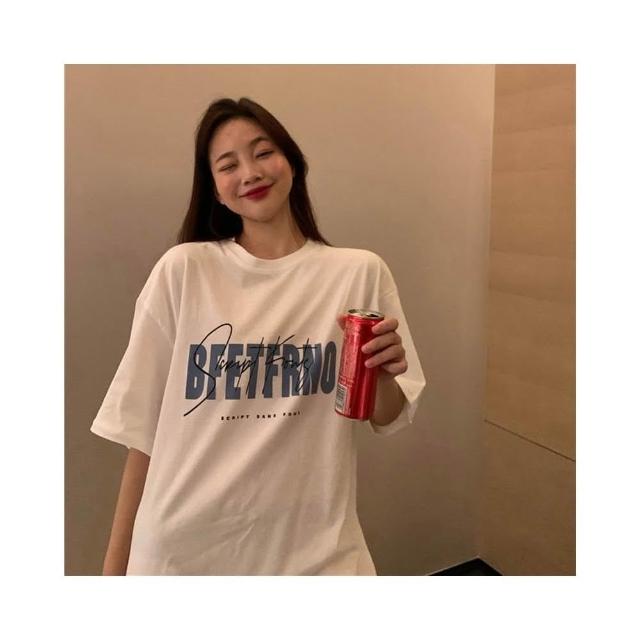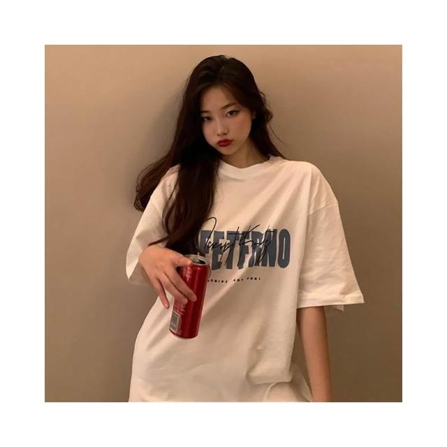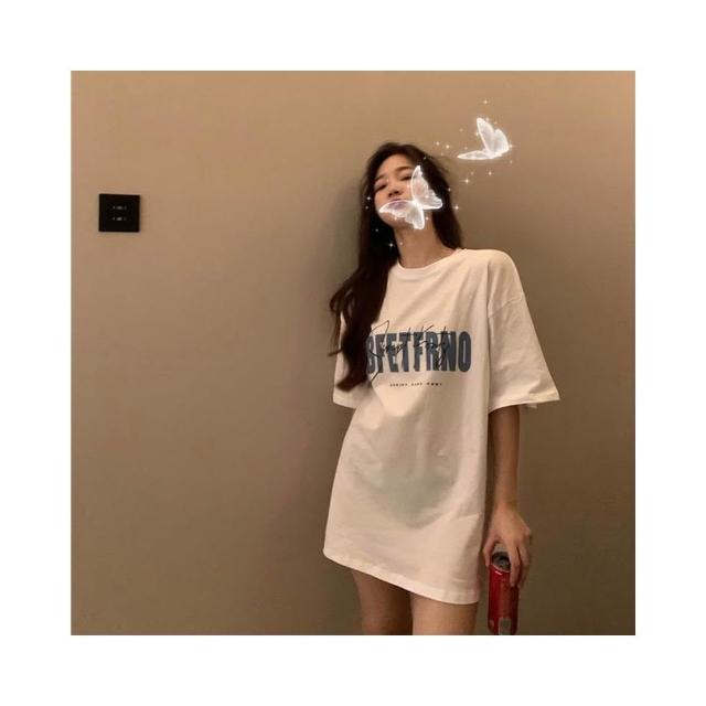 FUXI 短袖t恤女 短袖上衣 寬鬆白色t恤 韓版復古印花上衣 中長款上衣 打底衫 圓領上衣 女裝 衣服 A6641