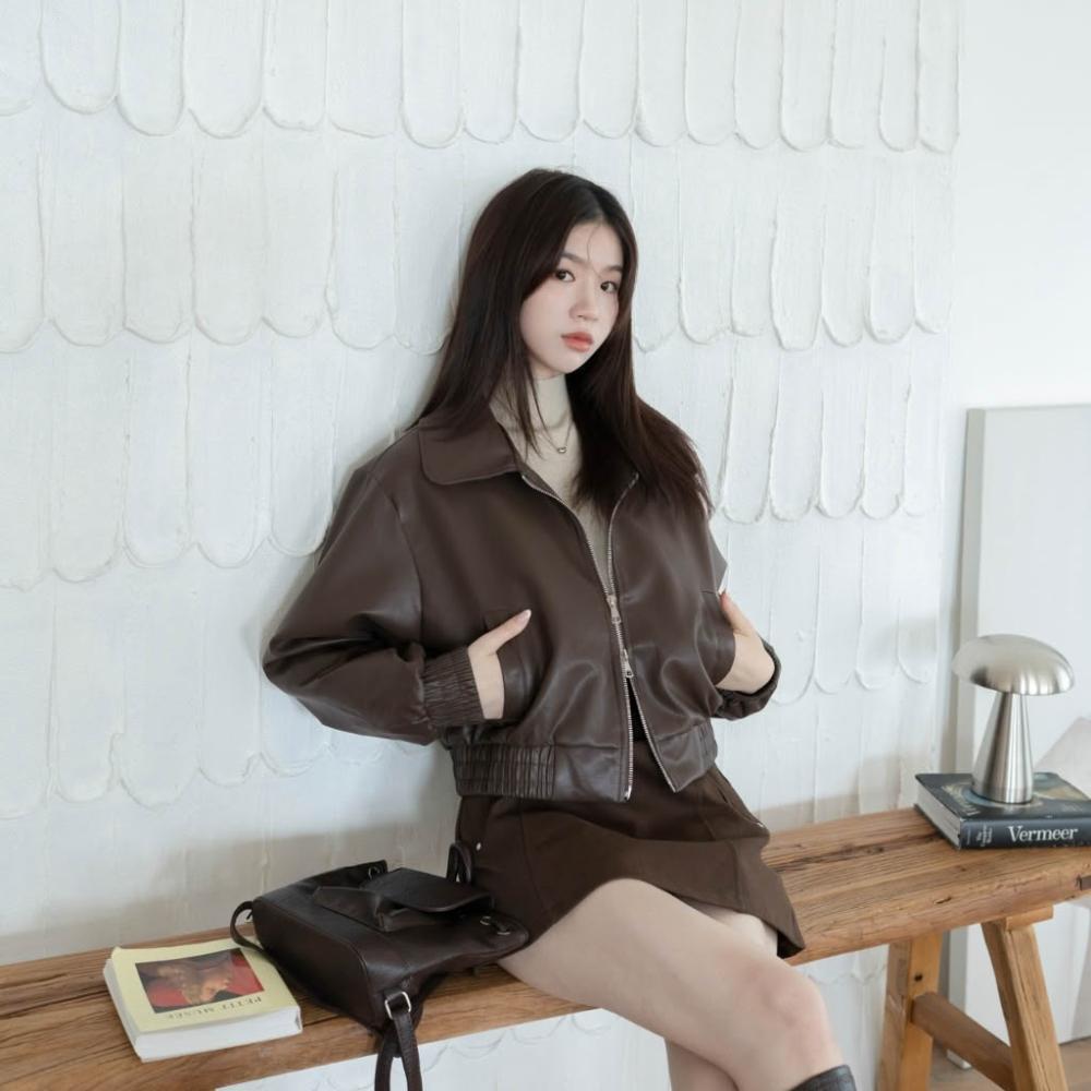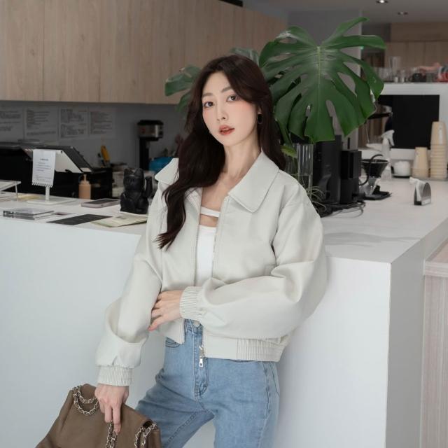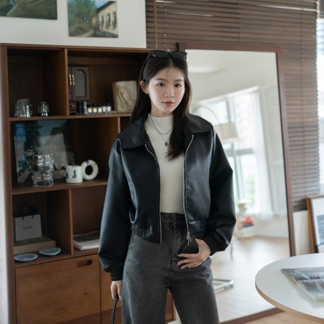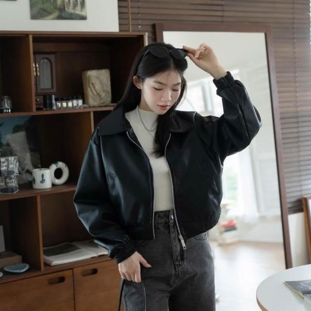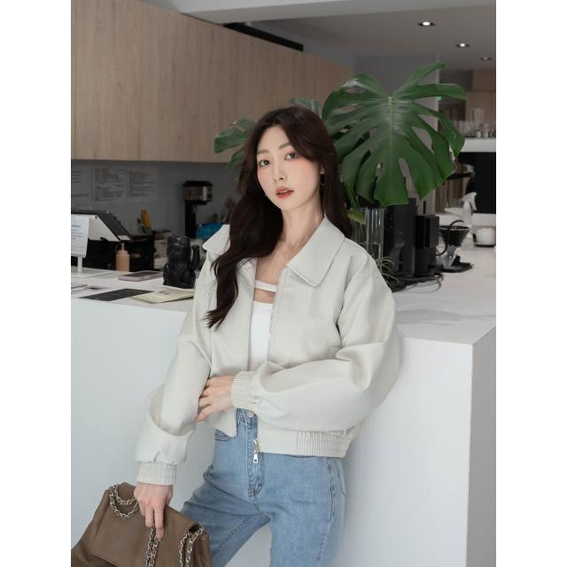 「現」韓女基因~翻領拉鍊口袋短版皮外套-DesireShop