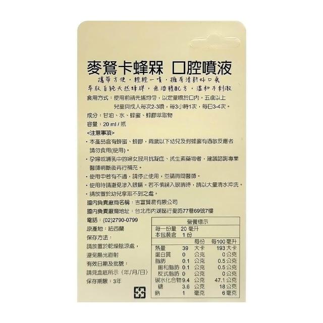 MANUKA 麥盧卡蜂膠噴液 口腔噴液 20ml/盒 (紐西蘭原裝進口/口腔噴液/壹品藥局)