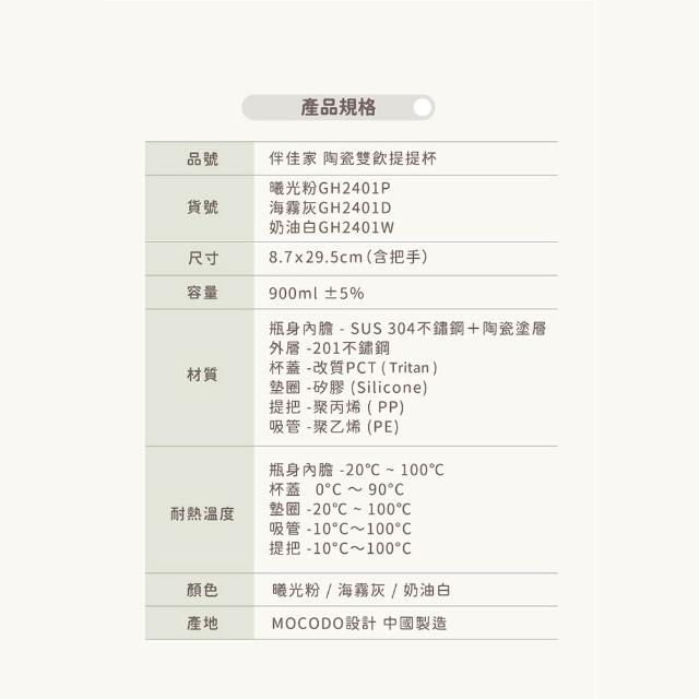 MOCODO 伴佳家陶瓷雙飲提提杯 900ml/盒 (保冰杯/陶瓷杯/隨行杯/壹品藥局)