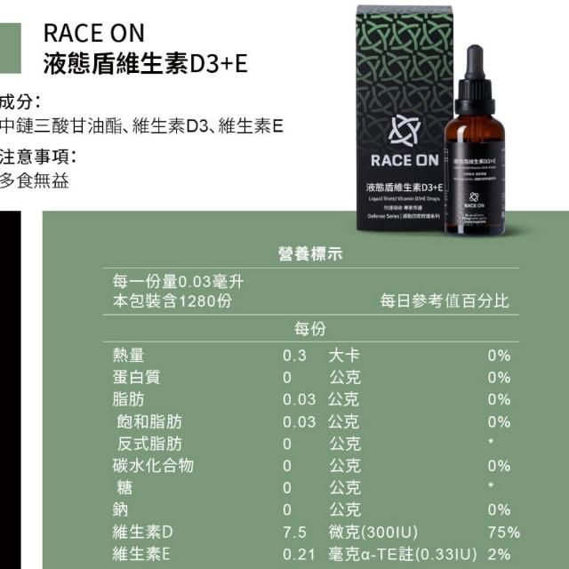 RACE ON銳速 液態盾維生素D3+E 40ml/盒 (維生素/壹品藥局)