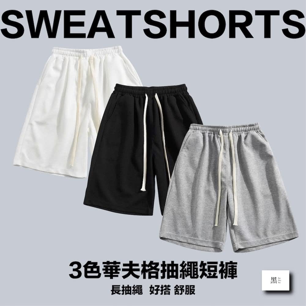 Bai Hey Bai 白黑白〔華夫格抽繩短褲〕台灣現貨 灰色棉褲 棉褲 短棉褲 華夫格褲 男生短褲 黑色短褲 抽繩短褲 休閒短褲 休閒褲 有開立發票