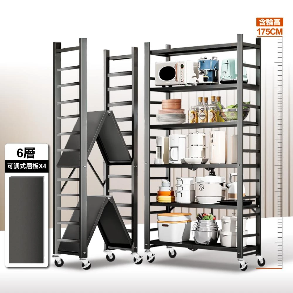 ANDYMAY272寬六層 升級全碳鋼免組裝折疊收納層架 -款式任選 ( 電器架 收納櫃 收納用品 廚房置物架 廚房架 收納架 洛克架)