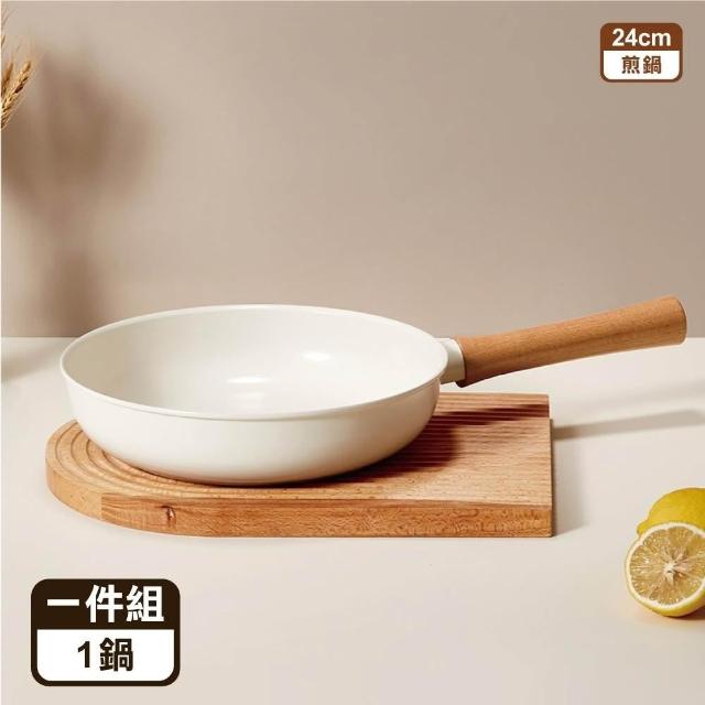 ANDYMAY2日式櫸木柄陶瓷不沾鍋_24CM煎鍋(泡麵鍋 不沾鍋 平底鍋 不沾鍋炒鍋 平底鍋 炒鍋 炒菜鍋 不沾湯鍋 櫸木手柄鍋)