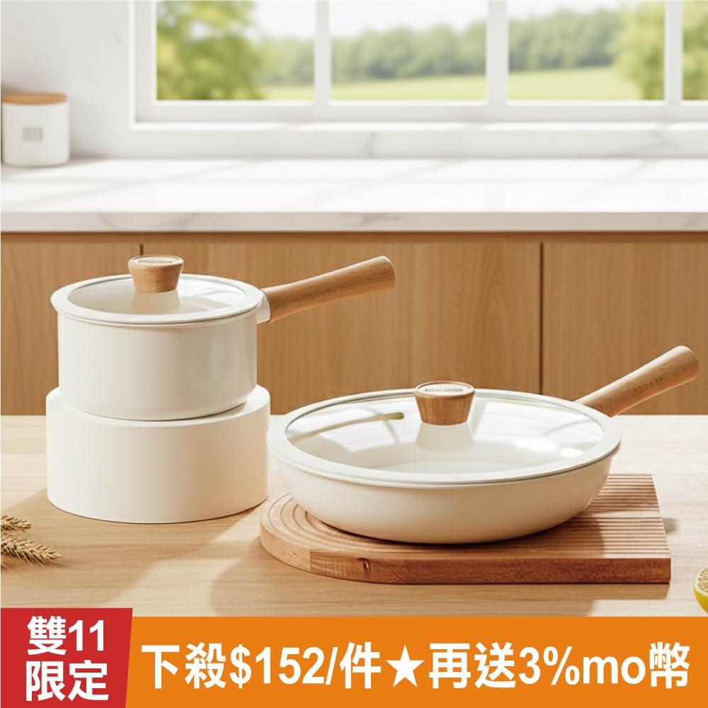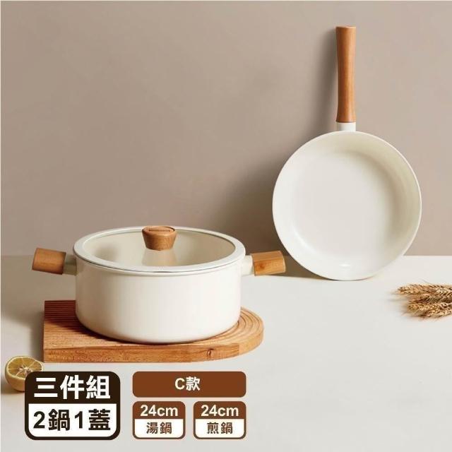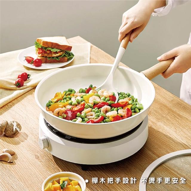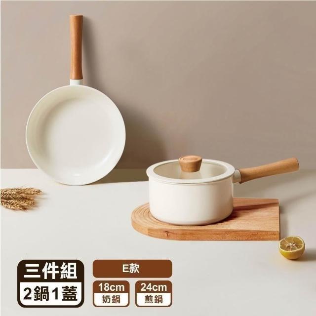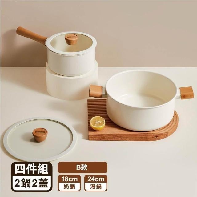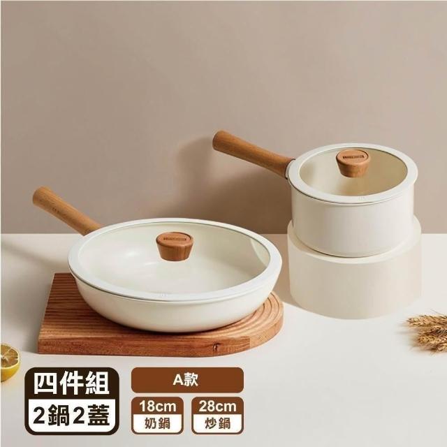 ANDYMAY2日式櫸木柄陶瓷不沾鍋-4件組(28炒鍋+18奶鍋附2蓋)(規格任選)(鍋具 炒鍋 湯鍋)