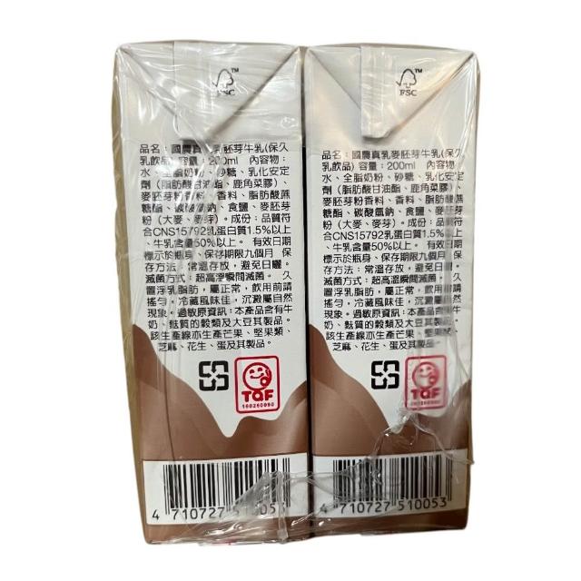 國農[即期福食]國農真乳 麥胚芽保久乳 200ml X 24入/箱(常溫牛乳)