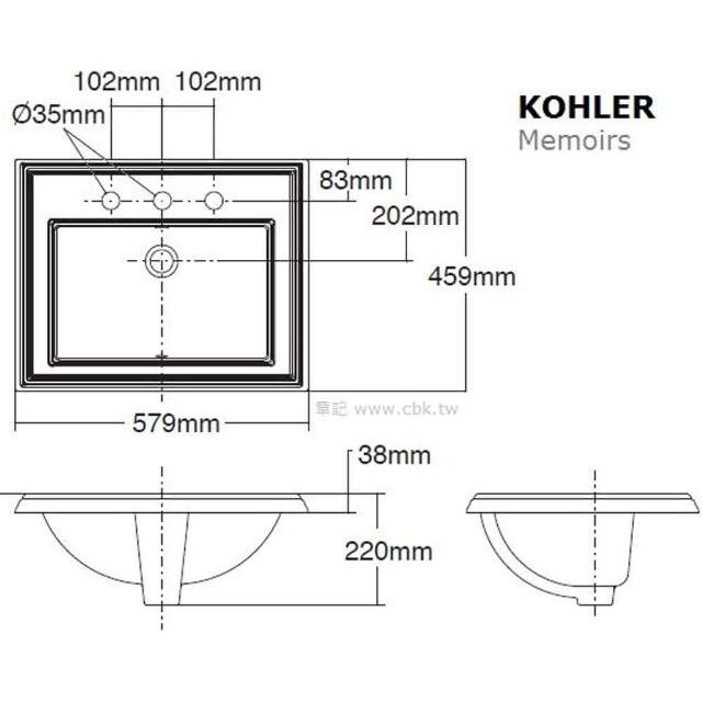 KOHLERMemoirs 三孔上嵌檯面盆(58cm) K-2241T-8-0 (章記)