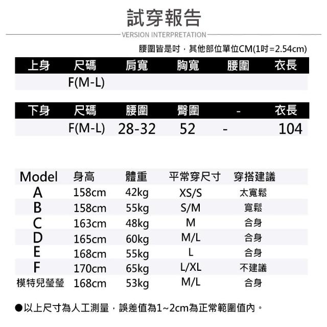 - 請參考尺寸表及試穿建議表