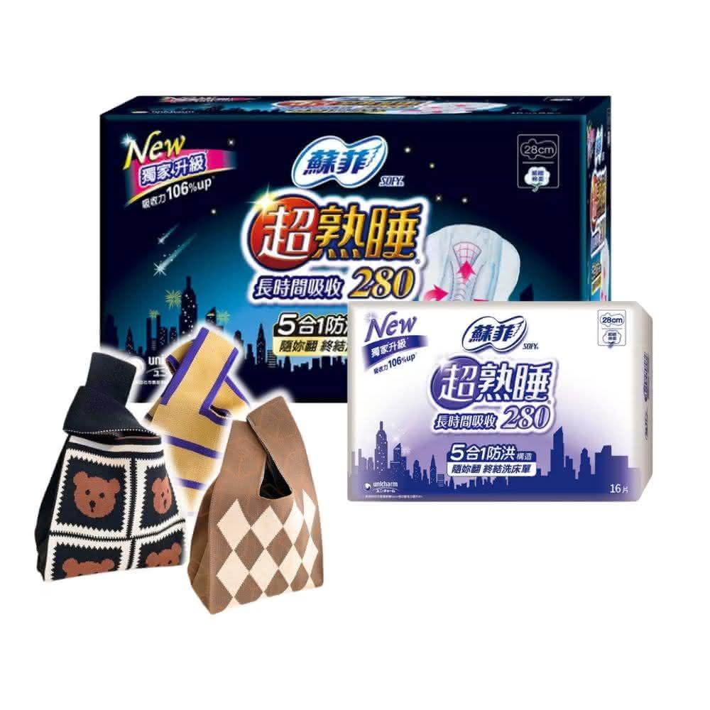 Sofy 蘇菲蘇菲🎊⟪箱購22入+手提針織包⟫🎊超熟睡長時間吸收夜用衛生棉 28公分16片 蘇菲超熟睡 夜用衛生棉
