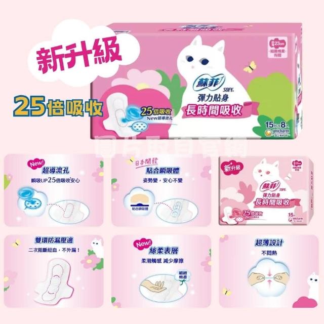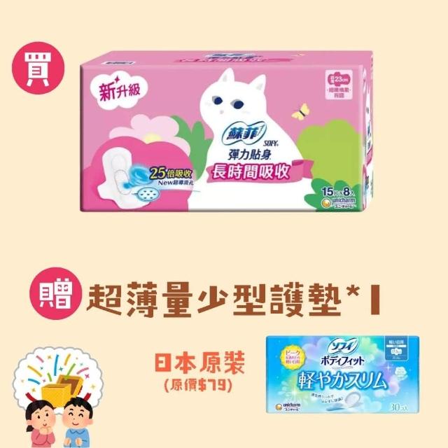 Sofy 蘇菲蘇菲⟪ 箱購8入+蘇菲(日本製)超薄量少型蝶翼護墊1包*30片⟫ 彈力貼身-超薄日用衛生棉23公分 15片 貼合瞬吸體 雙環防漏壓邊 絲柔表層